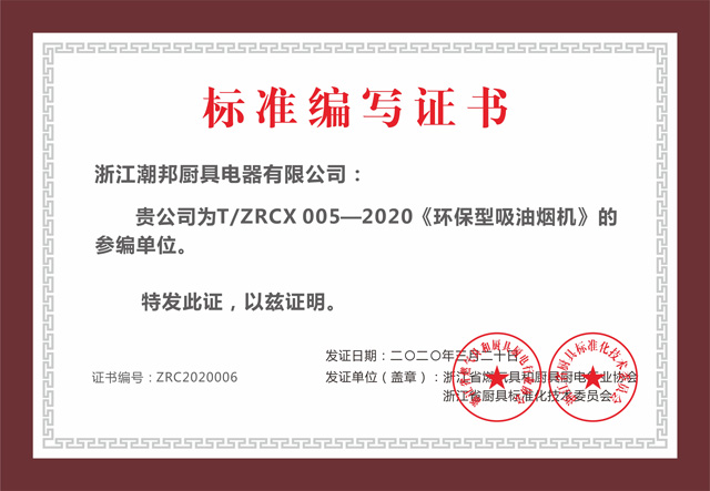 潮邦集成灶被浙江省燃氣具和廚具廚電行業協會授予T/ZRCX 005-2020《環保型吸油煙機》參編單位