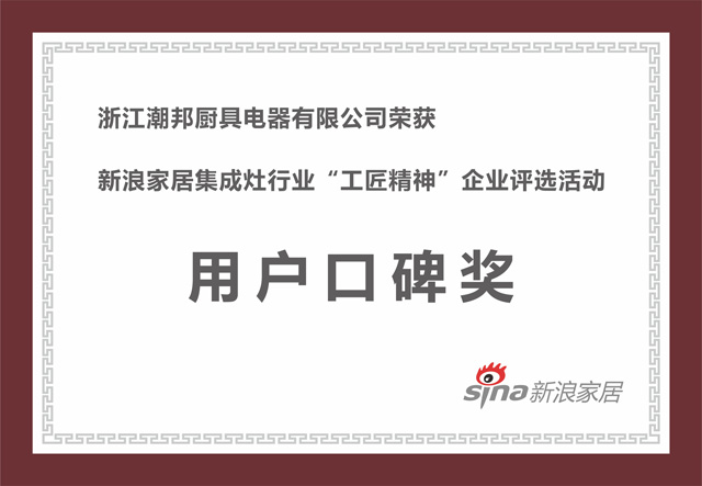 潮邦集成灶榮獲新浪家居集成灶行業”工匠精神“企業評選活動”用戶口碑獎”
