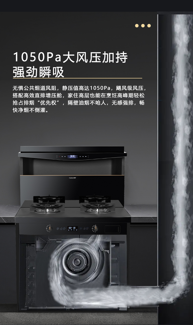 1050Pa風壓,智能變頻電機,揮手智控,曲面滑體無縫風道,一體瓷膜內膽,一鍵熱融清洗,5kW大火力